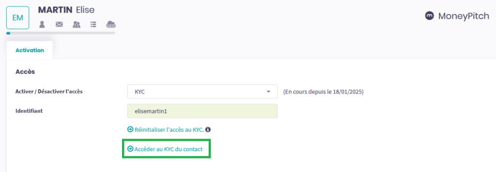 Après avoir ouvert un KYC pour votre client ou demandé sa mise à jour, vous pouvez y accéder et le pré-remplir : dans l’onglet MoneyPitch > Activation de votre client, le lien Accéder au KYC du contact, vous donne la possibilité de pré-remplir le formulaire KYC de votre client. Si par exemple vous connaissez le patrimoine de votre client, renseignez ses contrats et comptes de façon précise, sélectionnez les modes d’impositions et les informations qui ne sont pas forcément évidentes pour votre client. Au final faites-lui gagner du temps et gagnez-en vous-même aussi en évitant que le client saisisse des informations incorrectes.