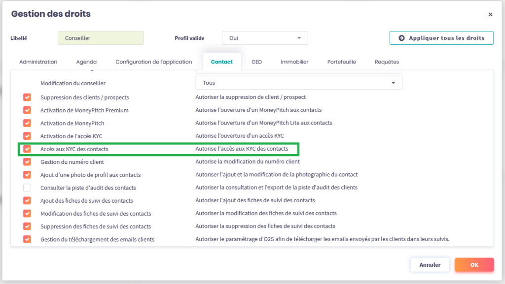 - Cliquez sur l’onglet Contact, puis cochez l’option Accès au KYC des contacts.