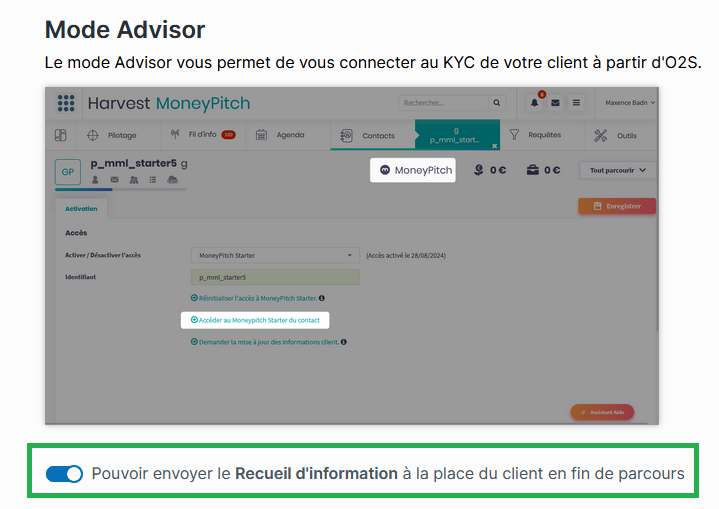 Le mode Advisor vous permet d’envoyer le recueil complété directement au nom de votre client. Cette fonctionnalité est particulièrement utile pour débloquer des situations où le client n’a pas compris qu’il doit cliquer sur « ENVOYER » pour transmettre les données à O2S.