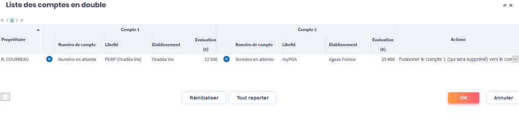 Notez que dans certains cas répondant à des règles de priorité de conservation des comptes, une action Fusionner le compte x (qui sera supprimé) vers le compte y (qui sera conservé) sera également disponible.