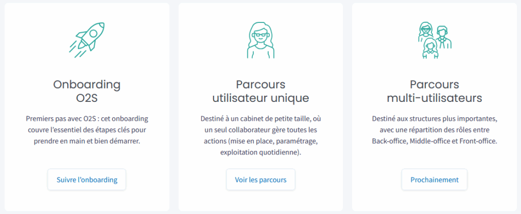 Explorez nos guides de prise en main adaptés à votre profil : un guide d’onboarding général pour bien démarrer et connaitre les possibilités d’O2S, un parcours dédié aux structures de petite taille, avec un seul collaborateur. Et bientôt, un parcours détaillé pour les grandes structures sera mis à votre disposition.