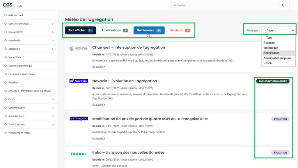 Passez ensuite au second niveau de filtrage pour affiner encore plus votre recherche. Vous pouvez ainsi cibler précisément les types d’interventions : Évolution, Interruption, Amélioration, Amélioration majeure ou Résolu et ainsi disposer d’un suivi plus pertinent.