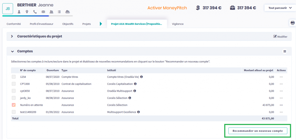 - Dans les projets O2S, depuis votre proposition, cliquez sur « Recommander un nouveau compte » , puis sélectionnez « AXA Wealth Services ».