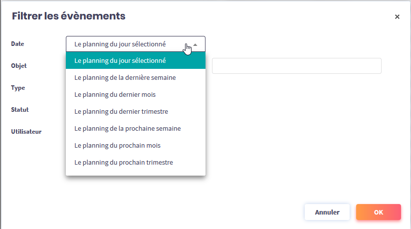 Vous pouvez désormais filtrer vos événements par période spécifique : dernière ou prochaine semaine, mois, ou trimestre. Cette fonctionnalité vous permet d’accéder plus rapidement aux informations pertinentes.