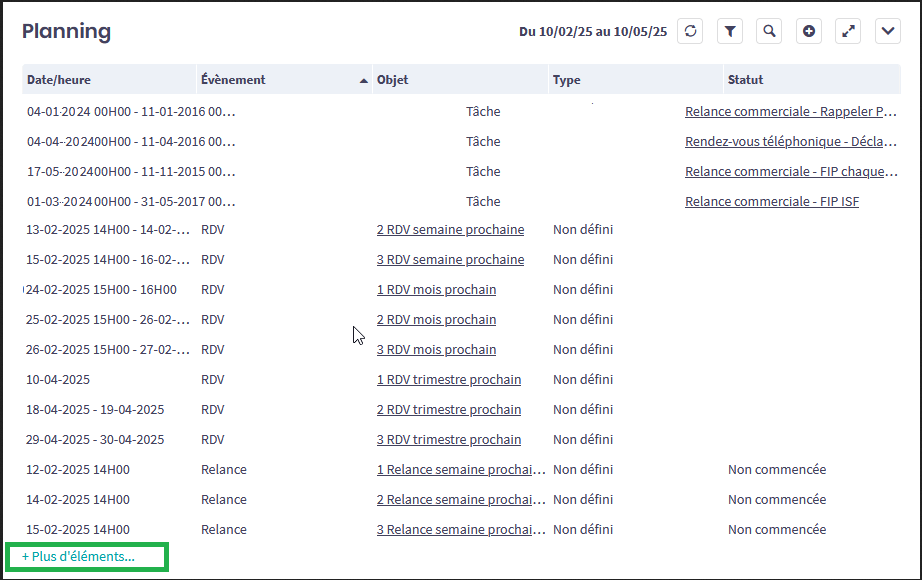- Les tâches et les relances non terminées apparaissent en première position, afin de prioriser les actions en attente.