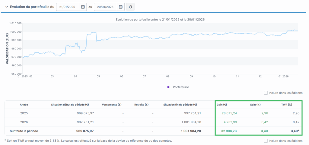 Désormais, vous bénéficiez de la méthode TWR (Time-Weighted Return), qui mesure la performance pure de gestion en neutralisant l’impact des flux. Idéale pour comparer la qualité de vos investissements en toute transparence. Rappel : le TRI intègre lui les flux pour un rendement global réel.