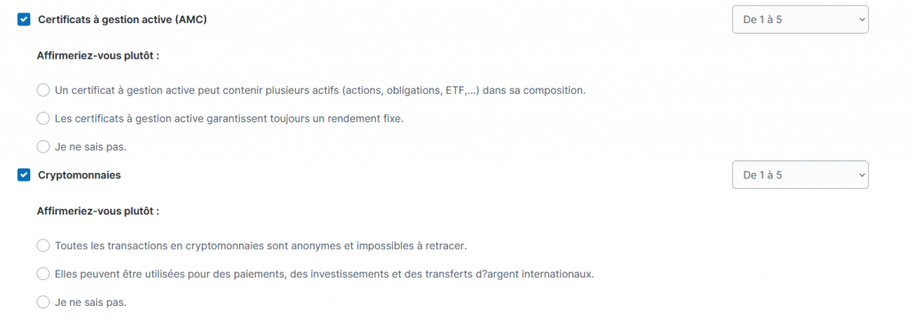 Dans la catégorie “Produits à effet de levier et produit boursiers”des questionnaires profils, 2 nouvelles questions permettent aux clients de préciser leurs connaissances produits sur les certificats à gestion active et les cryptomonnaies.