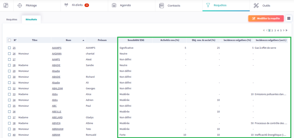 Les données ESG cochées figureront alors par défaut dans vos résultats de requête Contacts.