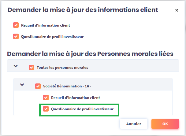 - Dans la section des Personnes morales liées, cochez les cases appropriées pour demander la mise à jour du Questionnaire de profil investisseur des sociétés concernées.