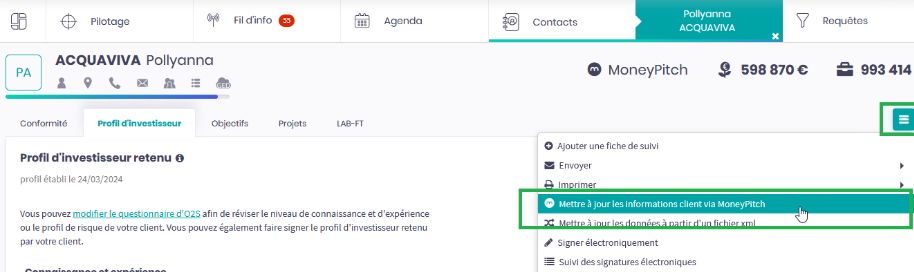 (burger) et sélectionnez Mettre à jour les informations client via MoneyPitch (ou Mettre à jour via KYC si le client ne dispose pas d’un MoneyPitch ou MoneyPitch Premium).