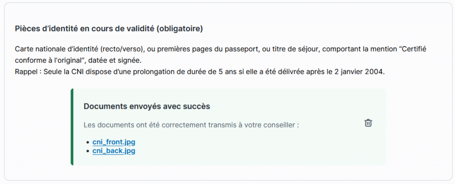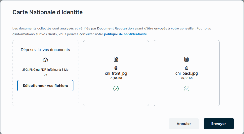A l’étape « Documents » de leur parcours KYC, il suffit à vos clients de sélectionner les fichiers sur leur poste de travail puis de les télécharger dans KYC.
