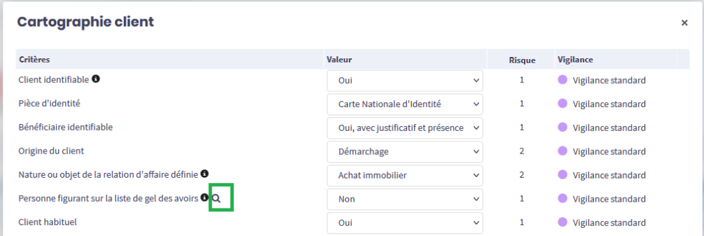 Sur la page Vigilance / LAB-FT de votre client, dans la section Cartographie (double-cliquez sur la ligne Client), une icône loupe