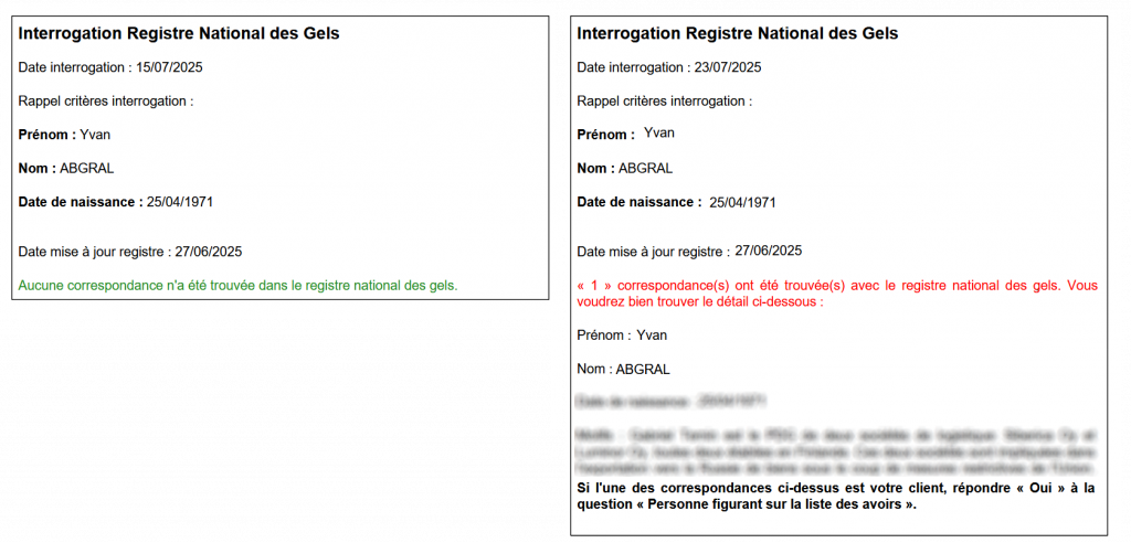 à droite du critère Personne figurant sur la liste de gel des avoirs vous offre, en cliquant dessus, la possibilité d’interroger le Registre National des Gels.