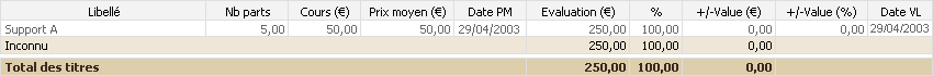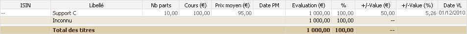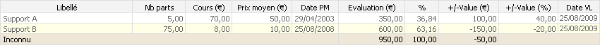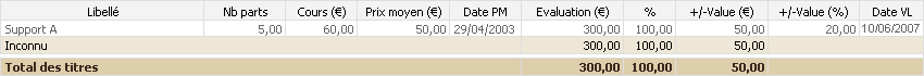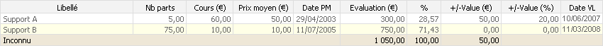 Le prix moyen d’achat du support est de 50 € et il y a 5 parts sur le compte. La VL de fin de période est de 60 €. La plus-value est donc égale à 50 € : (5×60) – (5×50) = +50 €