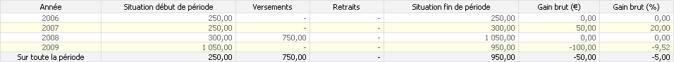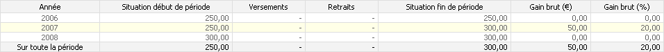 Nous constatons donc qu’en l’absence de mouvement et d’arbitrage, le gain brut est égal à la somme des plus-values (en euros) et la performance cumulée est égal au gain brut en pourcentage.