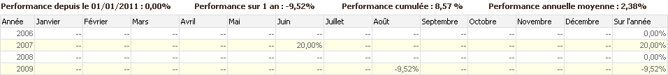 Soit une performance cumulée = ((1 + 20%) x (1 – 9.52%)) -1 = 8.57%