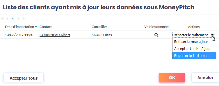 | Actions | Liste déroulante permettant de choisir le type de traitement de l’alerte d’un nouveau client. 3 choix sont possibles : Refuser la mise à jour : le client dont les données MoneyPitch ont changé ne vous sera plus présenté dans les alertes à venir. Accepter la mise à jour : intègre la mise à jour dans la fiche contact O2S. Cette action est définitive. La mise à jour des données est réalisée selon les options choisies dans le paramétrage du client (Contact > Tout parcourir > Autres > MoneyPitch). Cette action peut être effectuée par lot en cliquant sur le bouton Accepter tous. Reporter le traitement : le client dont les données MoneyPitch ont changé réapparaîtra toujours dans les alertes de ce type tant qu’aucune action définitive (Accepter ou Refuser) n’aura pas été effectuée. C’est l’action proposée par défaut. Ce choix est conservé même si vous fermez la fenêtre de traitement des alertes et que vous l’ouvrez à nouveau. |