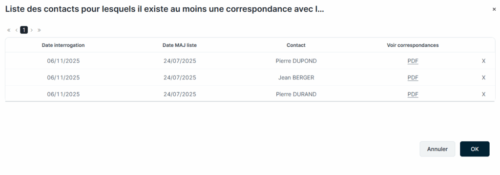 | Voir correspondances | Cliquez sur PDF afin de prendre connaissance des des informations du Registre ; c’est à partir de ces informations que vous pouvez vous assurer que la personne dont il est question est bien notre client ou non. |