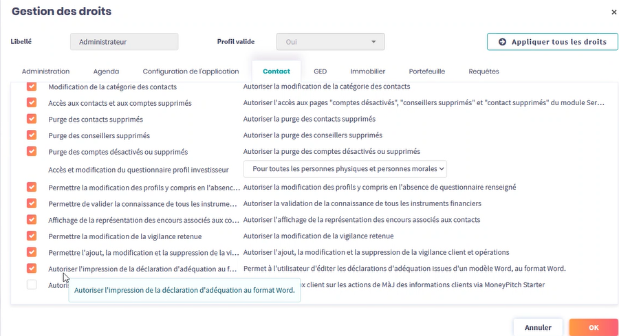 Rendez-vous dans l’Administration d’O2S, Profils utilisateurs > Gestion des profils > profil > Gestion des droits > onglet Contact, puis cochez le droit permettant de générer des Déclarations d’Adéquation au format Word. Si ce droit est décoché, les utilisateurs pourront uniquement générer des Déclarations au format PDF.