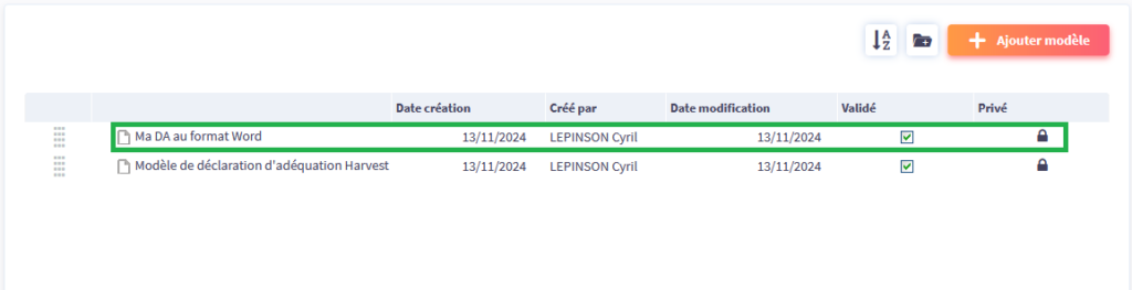 Votre modèle ainsi créé figure alors dans la liste des modèles de Déclaration d’adéquation au format Word.