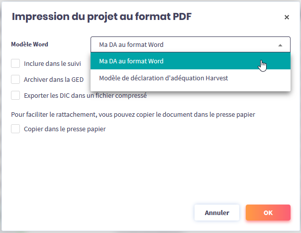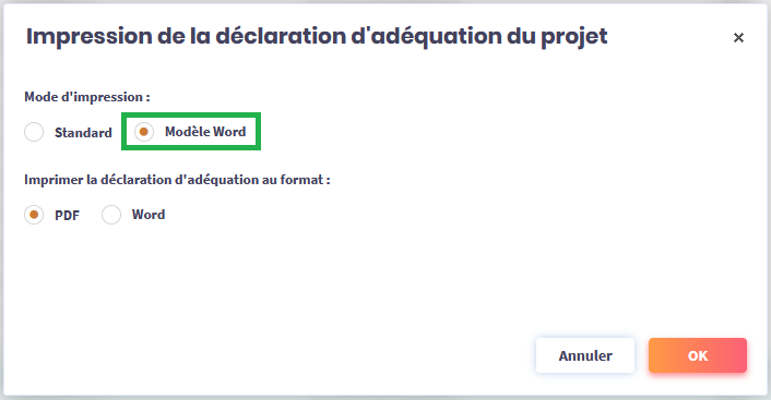 Dans la fenêtre Impression, sélectionnez votre modèle Word de Déclaration d’Adéquation, puis choisissez le format de sortie (PDF ou Word). Enfin, cliquez sur OK.