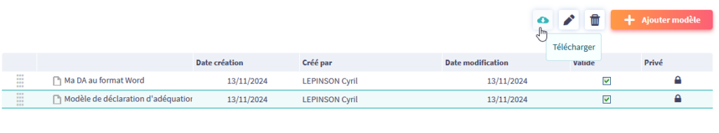 Pour créer votre modèle personnalisé, dans le module Services > Personnalisation > Paramétrage > Modèles Word > Déclaration d’adéquation, il vous suffit de télécharger le modèle Word Déclaration d’Adéquation Harvest, mis à votre disposition, en cliquant dessus puis en cliquant sur le bouton Télécharger.