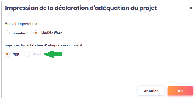 Note : si vous ne possédez pas le droit d’imprimer la Déclaration d’adéquation au format Word, seul le mode standard (PDF non modifiable) est disponible.