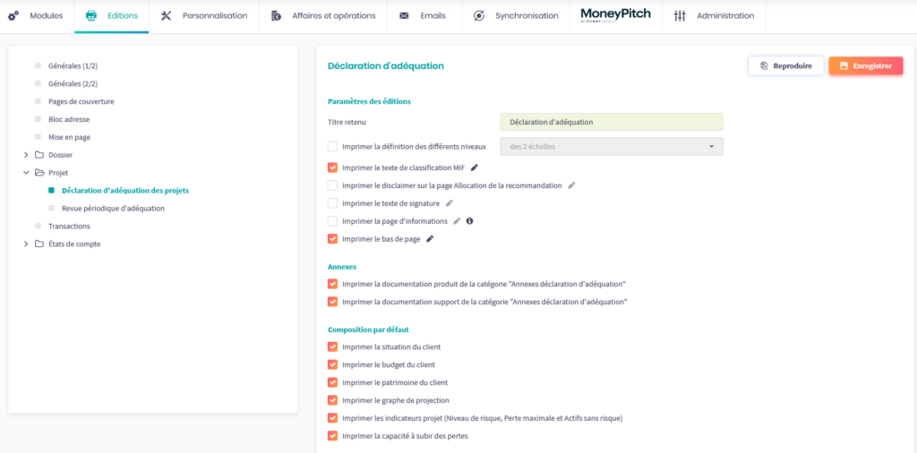 Note : cette fonctionnalité est activée par défaut ; pour la désactiver, décochez l’option dans Services > Editions > Projet > Déclaration d’adéquation des projets > Annexes.
