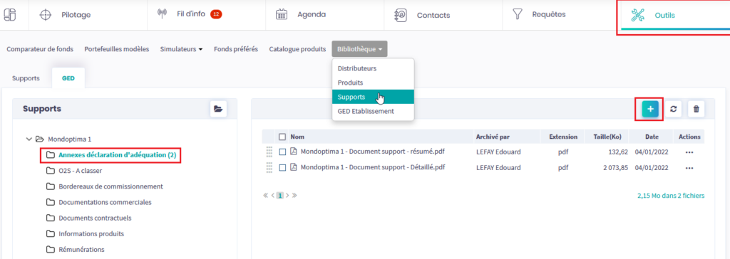Dans Outils > Bibliothèque > Supports, la GED de chaque support contient un dossier Annexes déclaration d’adéquation dans lequel vous pouvez ajouter les documents que vous souhaitez joindre à la déclaration d’adéquation.