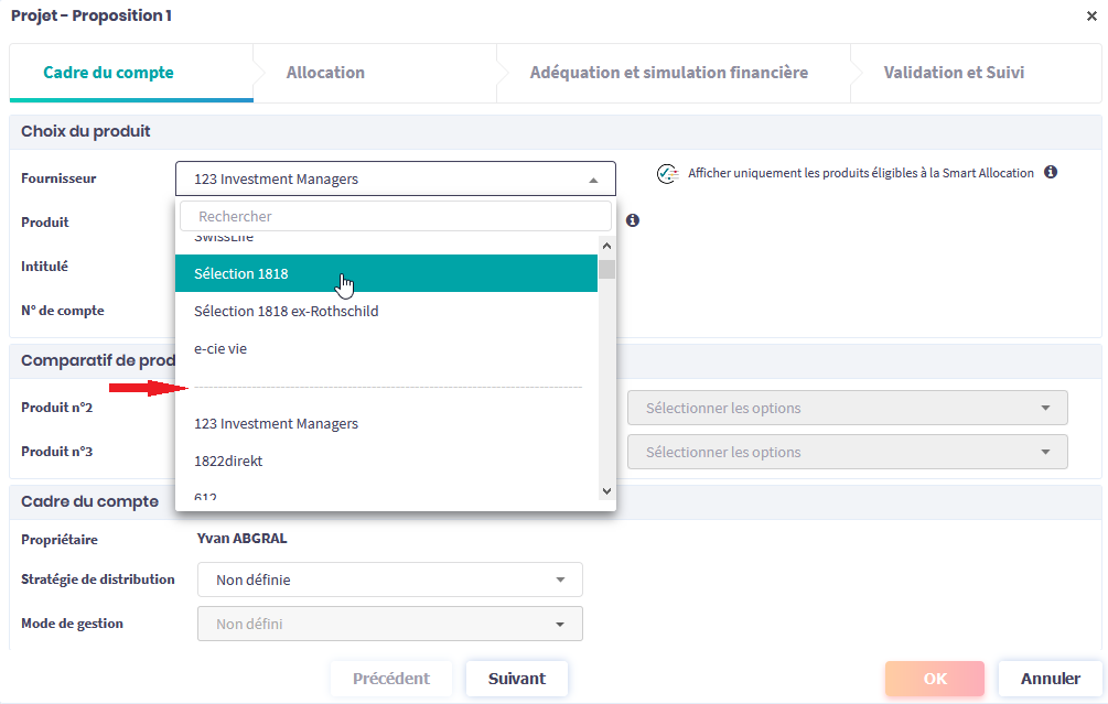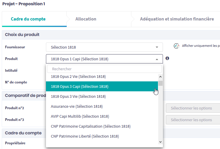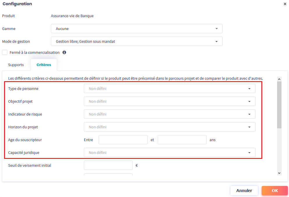 L’éligibilité des produits proposés au moment de constituer l’allocation d’un projet (espace Contact > Conformité > Projet d’O2S) peut être paramétrée grâce à des critères de sélection portant sur la personne, l’objectif, le risque, l’horizon du projet, ainsi que l’âge et la capacité juridique du contact.
