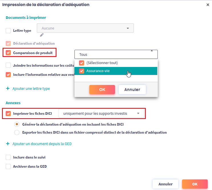 Lors de l’impression de la déclaration d’adéquation, une option permet d’intégrer à l’édition la comparaison des produits pour les recommandations de votre choix, et de joindre les fiches d’information de ces produits depuis votre GED produits.