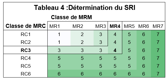 L’indicateur synthétique du risque global (SRI) est obtenu en combinant les classes de MRC et de MRM, conformément au Tableau 4 suivant :