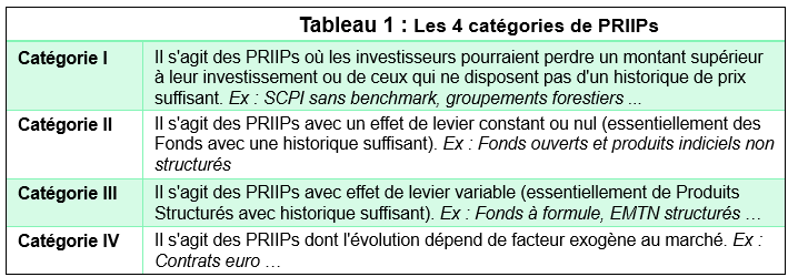 Un préalable au calcul du SRI consiste à sélectionner la catégorie à laquelle appartient le support d’investissement, parmi quatre (Tableau 1).