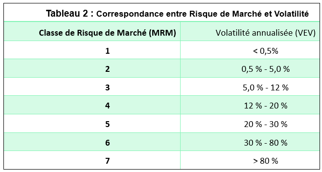 Hormis le cas des PRIIPs de « Catégorie I », chaque catégorie de PRIIPs se voit affecter une méthodologie[4] de calcul différente pour établir une volatilité annualisée (VEV) qui, via une table correspondance (Tableau 2), permet de déterminer la valeur du Risque de Marché, lequel détermine pour partie la classe de SRI du support d’investissement.