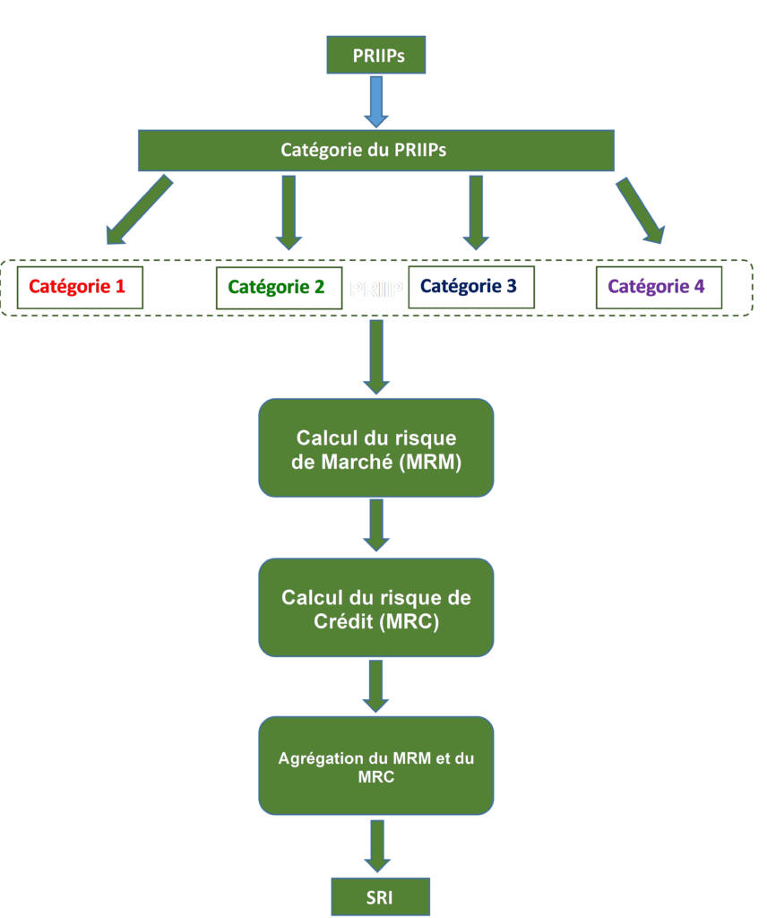 La détermination du SRI découle de l’enchainement plusieurs étapes. La première étape consiste à sélectionner la catégorie à laquelle appartient le produit, parmi quatre. Une fois celle-ci déterminée, une méthode de calcul spécifique s’applique pour évaluer le Risque de Marché. La détermination du Risque de Crédit quant à elle dépend des notations de crédit octroyées à l’émetteur. Une fois les valeurs du Risque de Maché et du Risque de Crédit calculées et combinées, on obtient la classe de SRI.