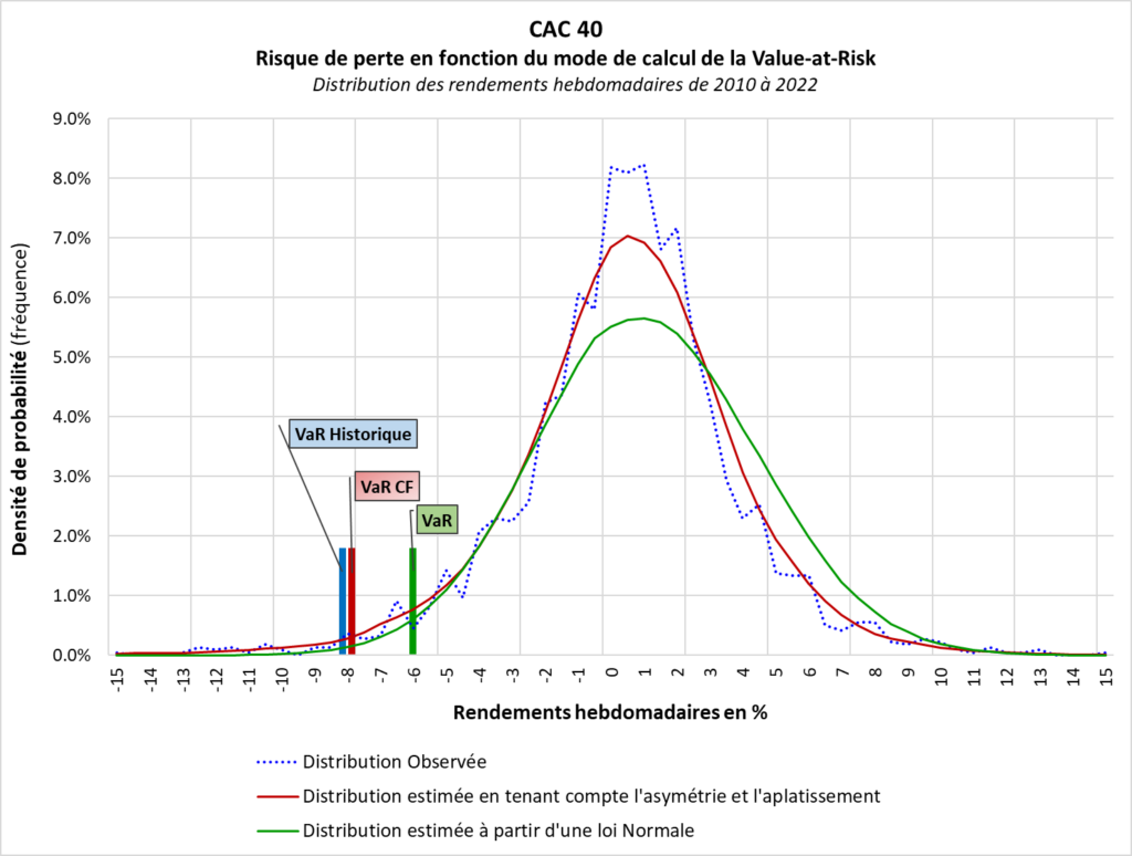Pour donner du corps à ce concept abstrait, sans pour autant s’attarder sur son calcul, on peut l’illustrer au travers de l’analyse de la distribution des rendements hebdomadaires du CAC 40. L’exercice est conduit sur une fenêtre d’observation volontairement longue (de 2010 à 2022) afin d’identifier correctement la nature de la distribution des rendements historiques.