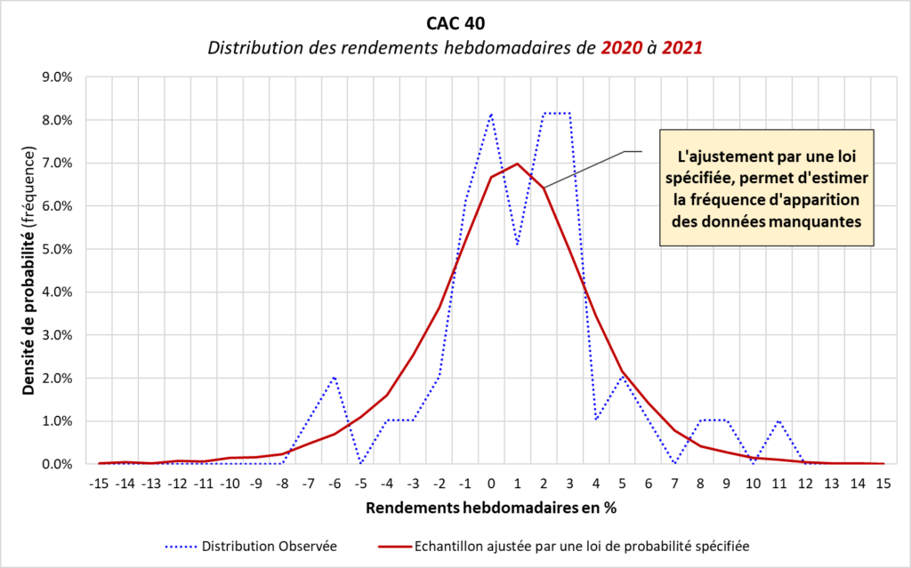 L’ajustement par une loi de probabilité permet de vérifier si la distribution empirique d’un échantillon de données (en l’occurrence nos rendements hebdomadaires) peut être approximée par une distribution théorique.