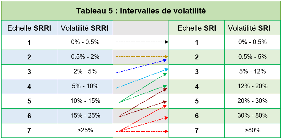 Le Tableau 5, qui résume l’ enchevêtrement des correspondances entre anciennes classes de SRRI et nouvelles classes de SRI, souligne la profondeur des impacts associés au passage de l’ancien au nouvel indicateur.