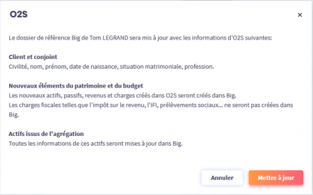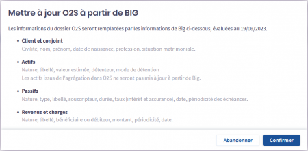 - En tant que logiciel dédié au patrimoine, Big dispose d’informations patrimoniales plus complètes qu’O2S. Ainsi, les mises à jour lancées depuis Big pourront mettre à jour ou supprimer du dossier O2S des actifs, passifs, revenus et charges existants dans O2S (à l’exception des actifs issus de l’agrégation).