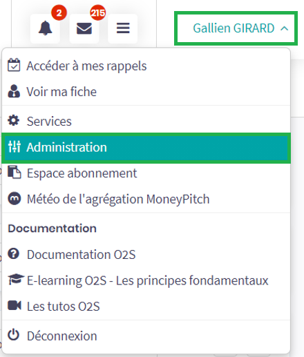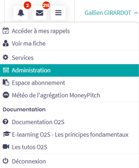 - Rendez-vous dans le module Administration en cliquant sur votre menu utilisateur (prénom nom) en haut à droite, puis sur Administration.