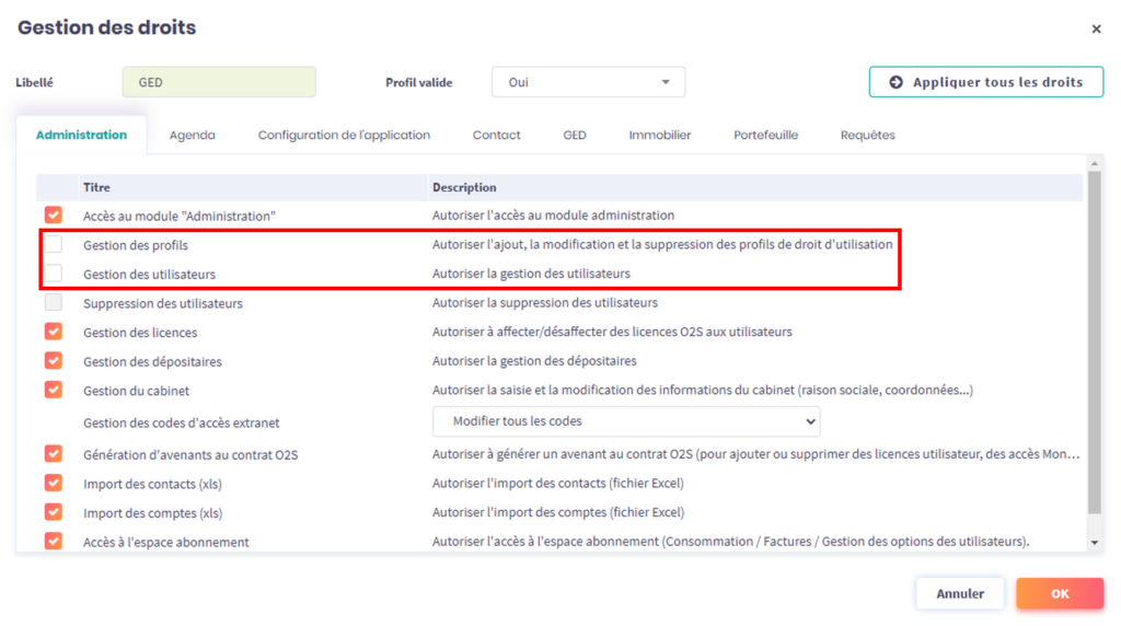 Vous devriez vous trouver dans le menu Gestion des droits. Afin que le profil que vous êtes en train de paramétrer ne puisse pas rouvrir les droits que vous voulez lui enlever, décocher Gestion des profils et Gestion des utilisateurs.