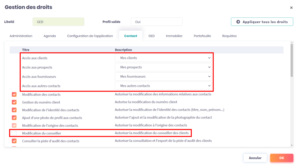 Sélectionnez Mes clients à l’aide du menu déroulant, pour que l’utilisateur n’ait accès qu’à ses clients. La manœuvre est la même pour les autres types de contact. Vous avez également la possibilité d’empêcher l’utilisateur affecté au contact.