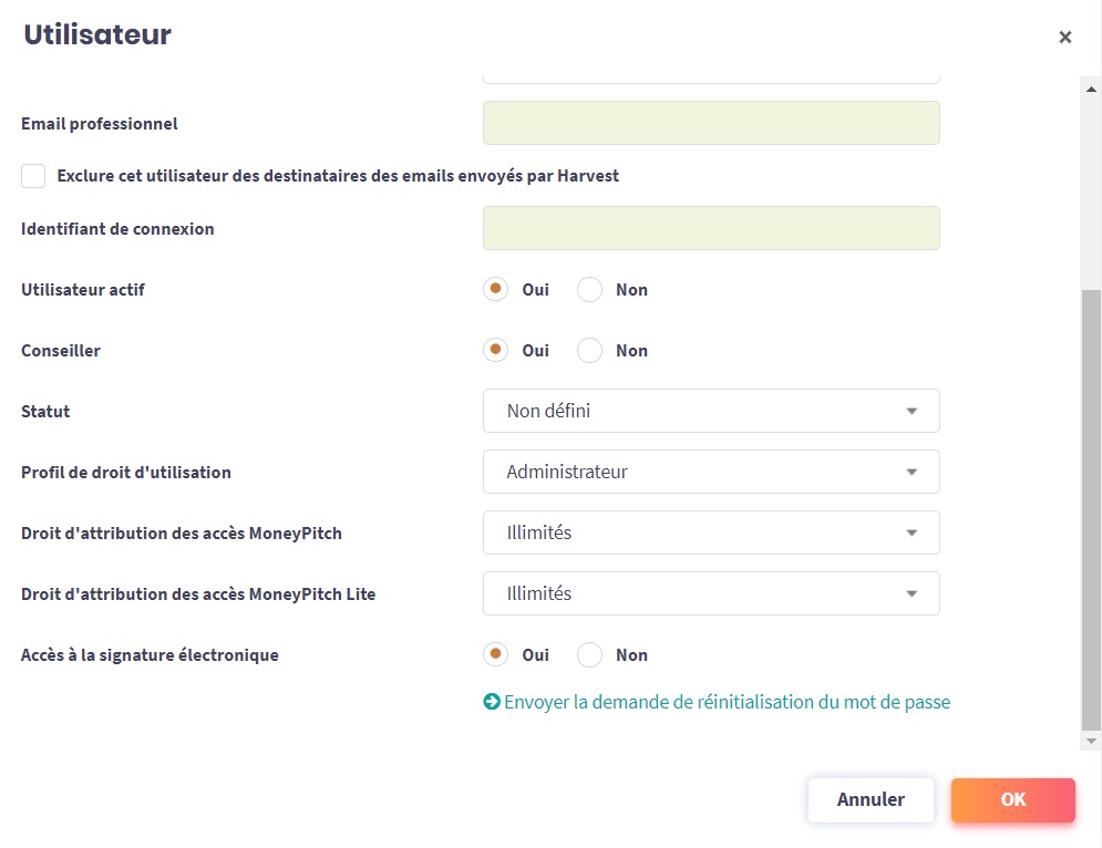 Utilisez la barre de défilement à droite pour voir toutes les options, notamment le profil de droits d’utilisation, et les droits aux accès de plusieurs fonctionnalités telles que les attributions d’accès MoneyPitch, MoneyPitch Premium, KYC, signature électronique et Fidnet.