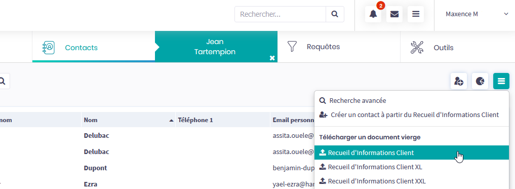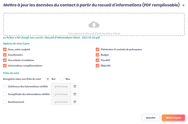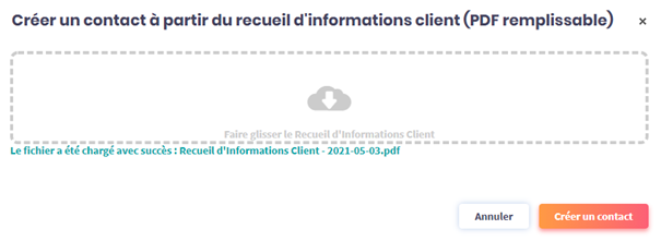 puis sur Créer un contact à partir du Recueil d’Informations Client puis de sélectionner le fichier renseigné par le client.