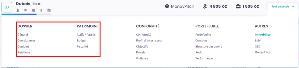 - Dans le dossier de votre client, cliquez sur le bouton Tout parcourir en haut à droite, puis cliquez sur Dossier > Coordonnées.