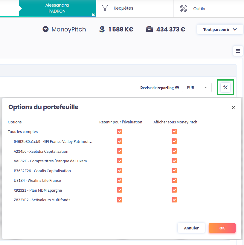 Pour cela, il suffit d’activer les comptes en question en les cochant dans la colonne Afficher sous MoneyPitch.