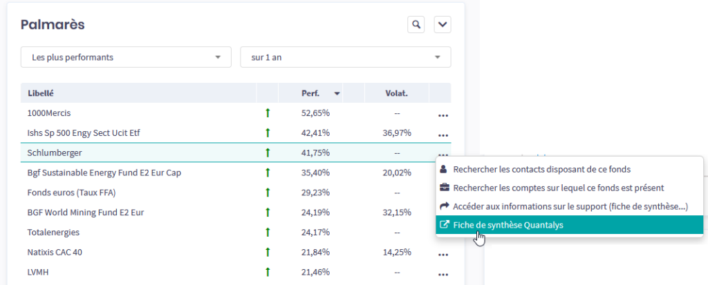 En plus des comptes de vos clients, vous pouvez également accéder à la richesse des fiches de synthèse Quantalys dans le bloc Palmarès, dans la page d’accueil :