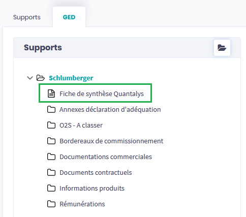 ou via la Bibliothèque de supports (rubrique Outils > Bibliothèque > Supports) : il vous suffit de double-cliquer sur un support, puis dans la GED qui s’affiche, vous pouvez alors accéder à la fiche de synthèse Quantalys.