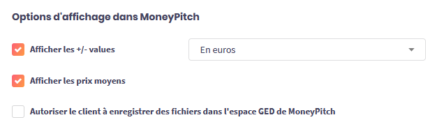 Les options Affichage des plus / moins-values, Affichage des prix moyens et Inclure les audits dans les éditions des états de comptes, définies par défaut pour tous vos contacts, peuvent être surchargées pour chaque client. Cependant, si vous modifiez la valeur de ces options par défaut, elles seront également modifiées dans la page de paramétrage MoneyPitch de tous vos clients.