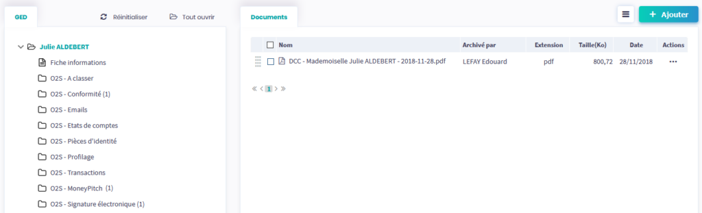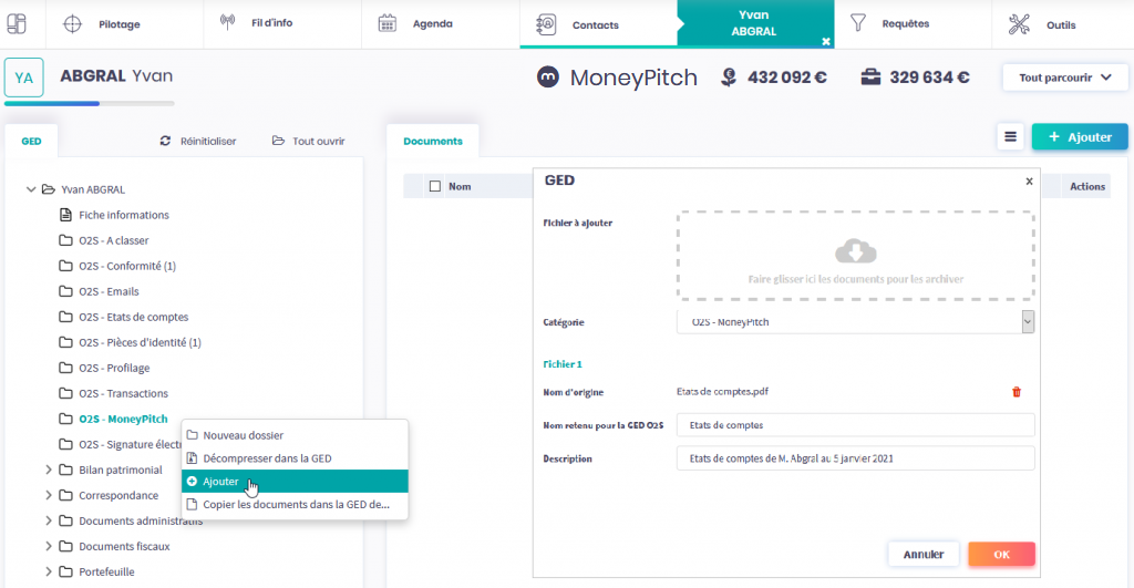 Mettre à disposition de vos clients des documents essentiels est très simple. Le module Contacts > Autres > GED offre la possibilité d’intégrer des documents directement dans l’application MoneyPitch. Il suffit de cliquer-droit sur le dossier O2S – MoneyPitch, puis de cliquer sur Ajouter afin de sélectionner le document de votre choix, en le faisant glisser sur la zone en pointillés ou en le cliquant depuis son emplacement.
